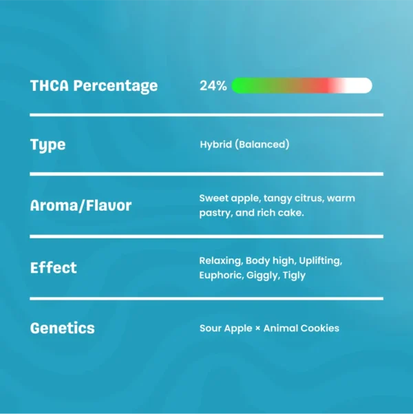 THCA: 15.03%  Type: Balanced hybrid  Flavor: Sweet apple pastry, vanilla, earthy, herbal, subtle diesel  Effect: Euphoric, relaxed, giggly, uplifting, Tingly  Genetics: Sour Apple x Animal Cookies Read More