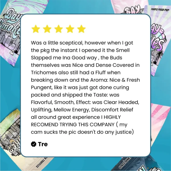 When you shop with Bay Smokes, you’re not just buying cannabis; you’re investing in an unforgettable experience! We pride ourselves on our diverse selection of premium THCa flower and a wide array of THCa products, from delicious edibles, vapes, and pre-rolls to potent THCa concentrates. We have everything you need to elevate your cannabis journey. With quick shipping as our top priority, you’ll enjoy your Bay Smokes products in no time.