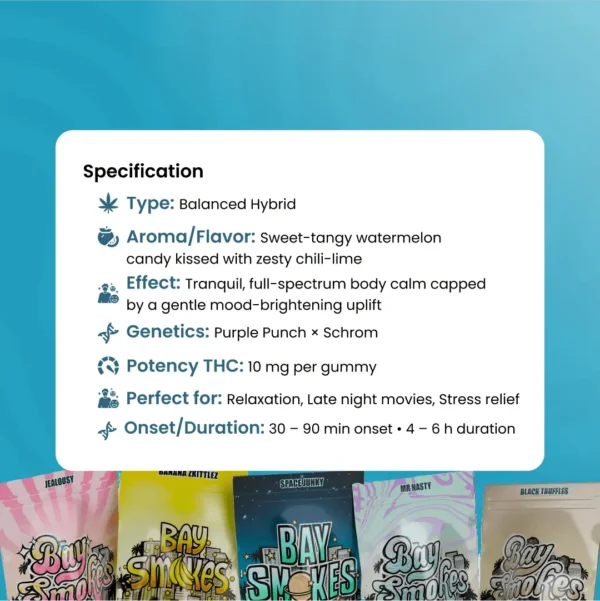 Specifications: Flavor: Sweet-tangy watermelon candy kissed with zesty chili-lime Effect: Tranquil, full-spectrum body calm capped by a gentle mood-brightening uplift Potency THC: 10 mg per gummy Perfect for: Relaxation, Late night movies, Stress relief Onset/Duration: 30 – 90 min onset • 4 – 6 h duration Read More
