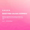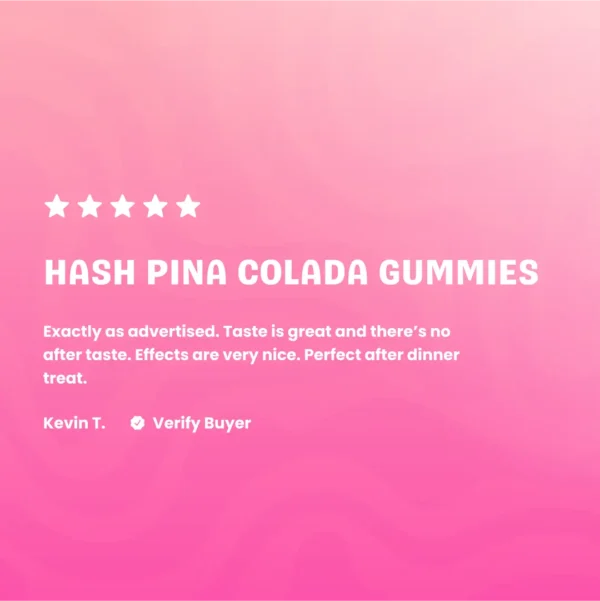 Ingredients: Light Corn Syrup, (Corn Syrup, Salt, Vanilla), Cane, Sugar, Water, Organic Apple Pectin, Citric Acid – ADM, Fruit And Vegetable Extract (Color), Natural Flavors, MCT Oil and Hemp Extract.