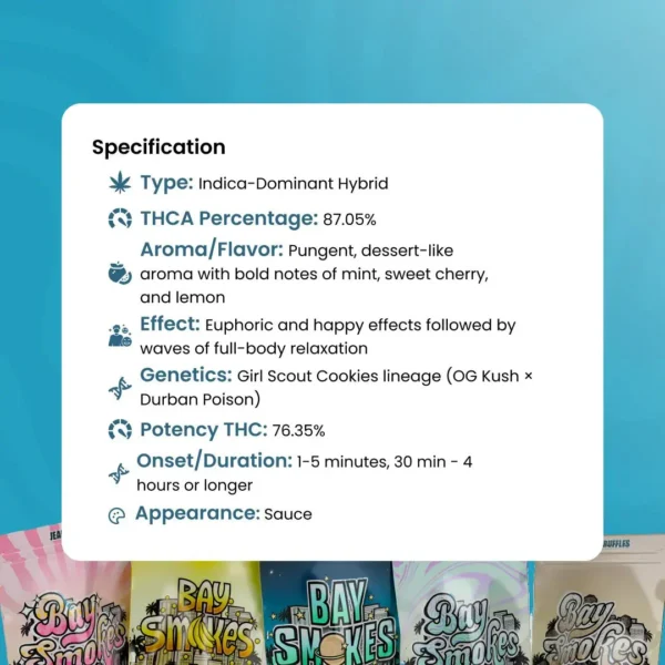 THCA: 87.05%  Type: Indica-Dominant Hybrid  Flavor: Pungent, dessert-like aroma with bold notes of mint, sweet cherry, and lemon  Effect: Euphoric and happy effects followed by waves of full-body relaxation  Genetics: Girl Scout Cookies lineage (OG Kush × Durban Poison)  Potency THC: 76.35%  Perfect for: Potent euphoria, deep relaxation, flavorful dabs, creative uplift  Onset/Duration: 1-5 minutes, 30 min – 4 hours or longer  Appearance: Sauce Read More