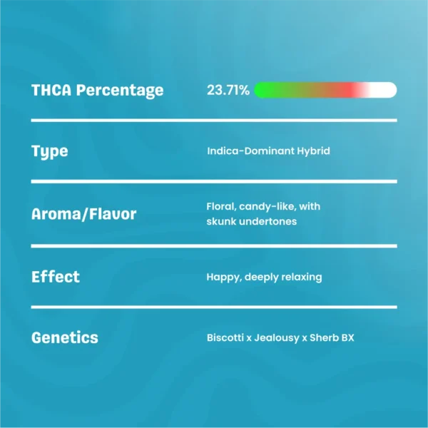 Limonene: Adding a subtle citrusy brightness, Limonene enhances mood and supports stress relief, rounding out the strain’s complex profile.