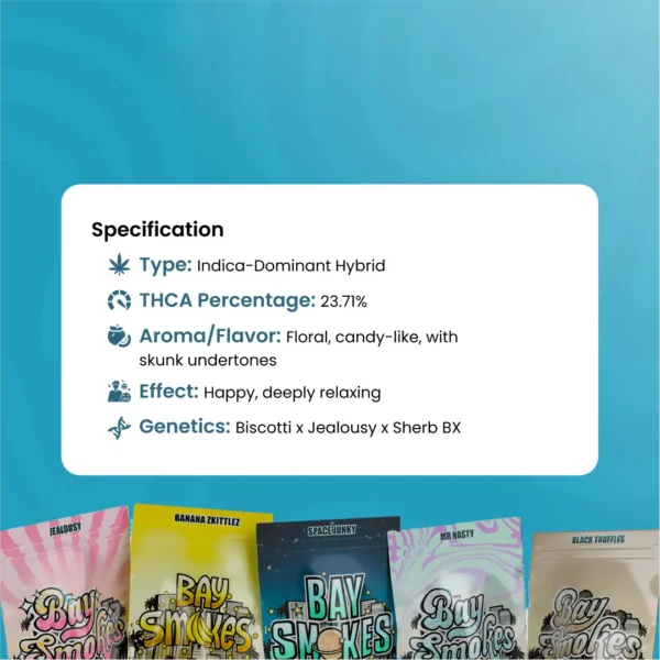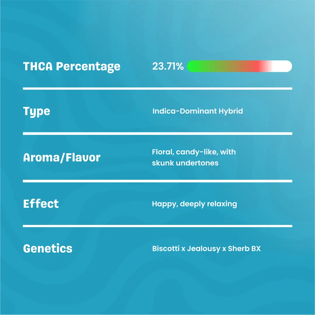 Myrcene: Contributing earthy, musky notes with hints of fruit, Myrcene is the backbone of the strain’s sedative effects. It promotes deep relaxation and complements the strain’s smoother flavor undertones.