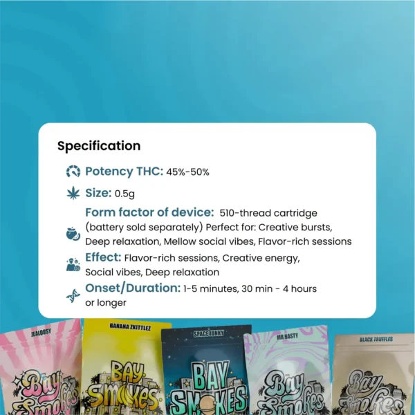 Specifications: Potency THC: 40%-60% Size: 0.5g Form factor of device: 510-thread cartridge (battery sold separately) Perfect for: Creative bursts, Deep relaxation, Mellow social vibes, Flavor-rich sessions Onset/Duration: 1-5 minutes, 30 min – 4 hours or longer Read More