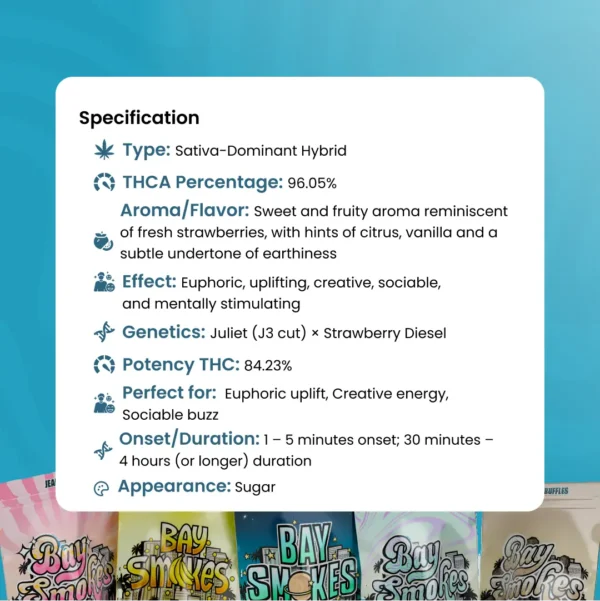 THCA: 96.05%  Type: Sativa-Dominant Hybrid  Flavor: Sweet and fruity aroma reminiscent of fresh strawberries, with hints of citrus, vanilla and a subtle undertone of earthiness  Effect: Euphoric, uplifting, creative, sociable, and mentally stimulating  Genetics: Juliet (J3 cut) × Strawberry Diesel  Potency THC: 84.23%  Perfect for: Euphoric uplift, Creative energy, Sociable buzz  Onset/Duration: 1 – 5 minutes onset; 30 minutes – 4 hours (or longer) duration  Appearance: Sugar Read More